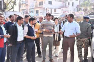 इसके अतिरिक्त उन्होंने डिम्पल पेट्रोल पंप से राधा तिराहा तक रोड का पैदल निरीक्षण किया व अलग अलग स्थलों पर लगभग 7 मीटर से 14 मीटर तक चौड़ाई की उक्त वर्तमान रोड को एक समान चौड़ाई की व्यवस्थित रोड बनाने हेतु रूप रेखा तैयार करने के निर्देश दिये।